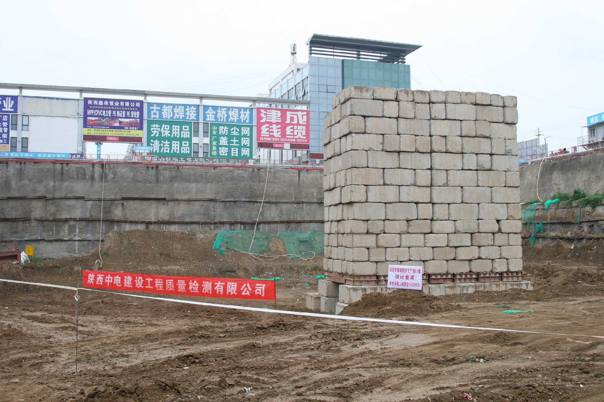 西安華南城有限公司1668新時(shí)代廣場(chǎng)項(xiàng)目A1樓,是自我院開(kāi)展樁基檢測(cè)業(yè)務(wù)以來(lái),進(jìn)行鉆孔灌注樁單樁豎向承載力試驗(yàn)反力堆載量最大的項(xiàng)目,上部堆載量高達(dá)18500kN。
